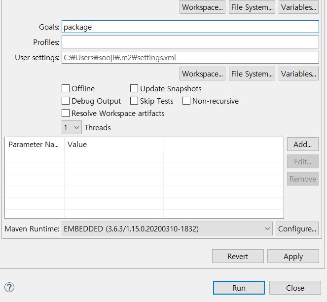 그냥 이클립스에 있는 Run as -> maven build... 클릭 -> Goals에 package 라고 입력